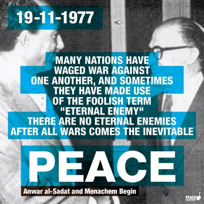 Another constant stream of images of people refusing to see each other as enemies came through the “Israel-Loves-Iran” facebook page, along with its various offshoots, “Palestine-Loves-Israel” and “Israel-Loves-Palestine.” Following their typical format, there were lots of photographs of Israelis, Palestinians and others bearing the words: “Please stop the war.” They also marked the anniversary of President Sadat’s visit to Jerusalem in 1977 with a photograph of him meeting Prime Minister Begin, and a series of superimposed statements they made about war and peace.