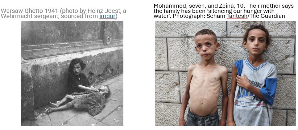 Now, however, there is a sharper, more immediate, more difficult pain of recognition and remembrance. Now I – or we, but I can speak only for myself – feel through the sorrowful story of Srebrenica the utter grimness of the genocide perpetrated in Gaza, not by the wicked hands of others, but by our own hands, the hands of Israeli Jews, and are we not, as the Talmud says, all responsible for each other? Responsible not only for each others’ safety, for redeeming our hostages, but also for each others’ heinous actions and inactions? We do not need to wait for Alisa’s father’s video to be smuggled out of Srebrenica or for victorious allies to film liberated camps. Every moment on 24 hours news channels and social media platforms we can see starvation being used as a weapon of this war of annihilation, despite the frantic, denials of Israeli spokespersons and the silence of most Israeli media. Can we not hear in the disgraceful, sinful planning of Israeli politicians and generals for the ever-tighter concentration of Palestinians in Gaza the echoes of the ghettos and concentration camps? Can we not see that the utter depravity of starving a Jewish child in Warsaw is as utterly depraved when it is a child in Gaza?