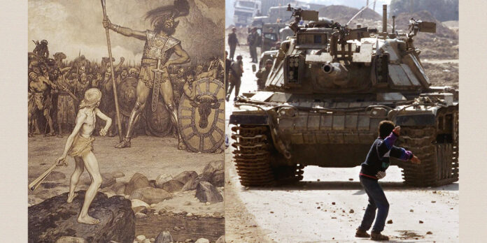 Not that I thought of my childhood essay at the time, but my experience of living in Jerusalem throughout the first intifada thoroughly dispelled the mythology of Israel as the small David and Palestinians as the giant Goliath. The uprising pitched mostly unarmed Palestinians in the Occupied Territories against Israel, the regional military superpower. Frequently, Palestinian youths – the Shabab – throwing stones or using catapults confronted and harried Israeli troops whose commanders were ill-prepared for handling a mass civilian uprising. Although I had no television at home at the beginning of the intifada, I did not need to see live pictures of slingshots pitched against rifles and armored vehicles to understand that the typical media framing of the conflict had shifted and even been reversed in Israel as well as abroad, even in the USA, as noted by Ella Shohat in 1991. Palestinians became David and Israel Goliath. Perhaps the Palestinians did not have God on their side, as did David, but they certainly had justice on their side as the rebelled against illegitimate and unrelenting military rule.
