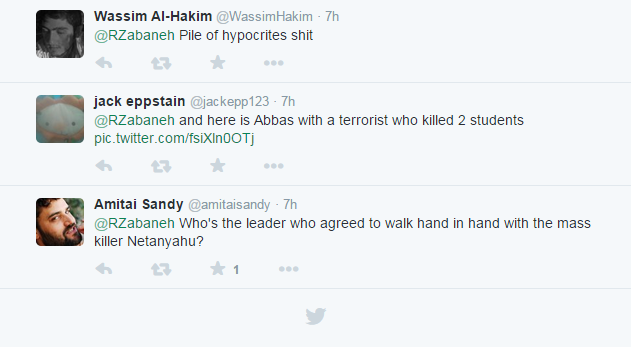 But Twitter isn’t such a forgiving space, hardly a site for dialogue and reconciliation. Almost as soon as it was noticed how close Abbas and Netanyahu were to each other, other Tweeters were quick to condemn both of them as murderers.