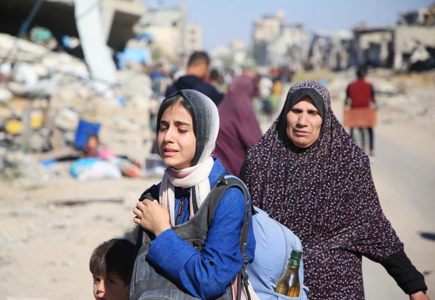 A Palestinian girl cries as the Israeli army forcibly moves civilians from the outskirts of the Jabalia refugee camp in northern Gaza on Tuesday.Mahmoud Sleem / Anadolu via Getty Images